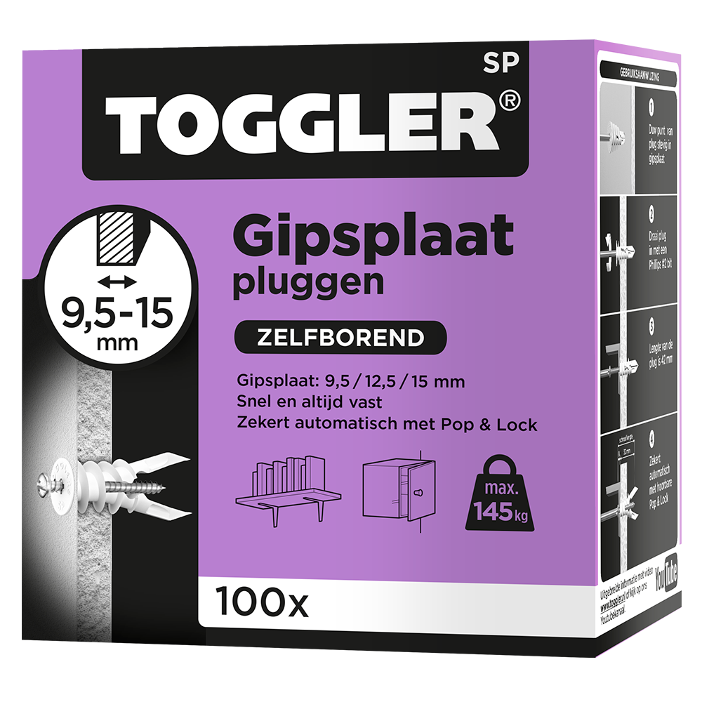 De 9,5 tot 15 mm-Gipsplaatplug is bestand tegen schokken en trillingen en daardoor ideaal voor het bevestigen van lichte tot middelzware voorwerpen. Denk aan gordijnrails, een schilderij, lamp of kapstok. Gebruik voor het monteren voldraadschroeven van 3,5 tot 4,5 mm dikte en een minimale lengte van 32 mm plus de dikte van het materiaal. De voldraadschroeven kunnen meerdere keren in- en uitgedraaid worden zonder verlies van houvast. Gebruik een ø 8 mm boor bij gipsplaten met stuc, dubbele gipsplaat of hardere gipsplaten zoals vocht, brandwerende en stootvaste gipsplaten. De Toggler SP-Gipsplaatpluggen zijn verkrijgbaar in verpakkingen van 6, 20, 40 en 100 pluggen. Ze zijn makkelijk te herkennen aan de paarse kleur.