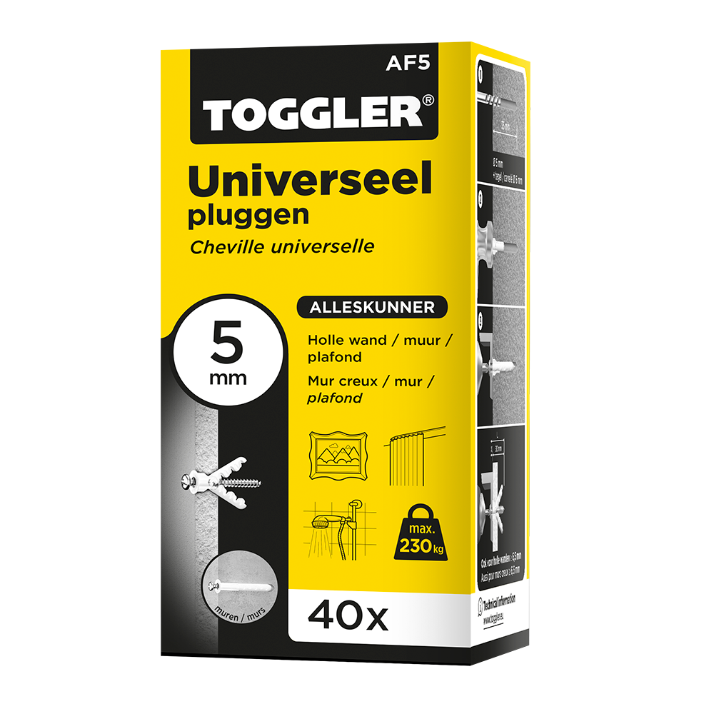De 5 mm-muurplug is bestand tegen schokken en trillingen en is maximaal te belasten met 230 kg*. Ideaal voor het bevestigen van lichte tot middelzware voorwerpen, zoals een gordijnrail, spiegel of fotolijst. Bevestig het voorwerp in combinatie met voldraadschroeven van ø 3,0 tot 4,5 mm dikte en een minimale lengte van 30 mm plus de dikte van het te bevestigen voorwerp. De schroeven kunnen meerdere keren in en uitgedraaid worden zonder verlies van houvast. Gebruik een ø 5 mm boor. De Toggler Alligator pluggen zijn verkrijgbaar in verpakkingen met 6, 20, 40 en 100 pluggen. Ze zijn makkelijk te herkennen aan de gele kleur.