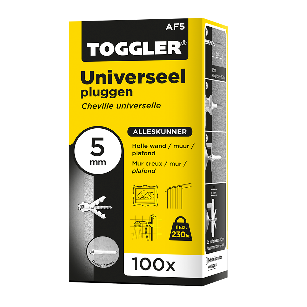 De 5 mm-muurplug is bestand tegen schokken en trillingen en is maximaal te belasten met 230 kg*. Ideaal voor het bevestigen van lichte tot middelzware voorwerpen, zoals een gordijnrail, spiegel of fotolijst. Bevestig het voorwerp in combinatie met voldraadschroeven van ø 3,0 tot 4,5 mm dikte en een minimale lengte van 30 mm plus de dikte van het te bevestigen voorwerp. De schroeven kunnen meerdere keren in en uitgedraaid worden zonder verlies van houvast. Gebruik een ø 5 mm boor. De Toggler Alligator pluggen zijn verkrijgbaar in verpakkingen met 6, 20, 40 en 100 pluggen. Ze zijn makkelijk te herkennen aan de gele kleur.