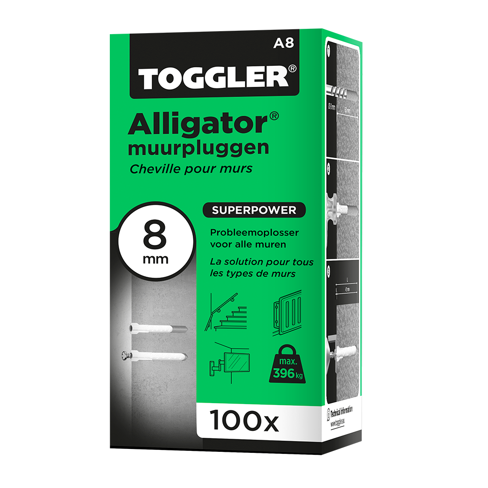 De Toggler Alligator muurplug A8 gebruik je voor het bevestigen van voorwerpen aan massieve muren, zoals cellenbeton of kalkzandsteen. Met de Alligator® heb je in alle situaties maximale grip. Door de kaken bijt de plug zich muurvast. Zo monteer je jouw objecten veilig en solide. De ø 8 mm-muurplug is bestand tegen schokken en trillingen. Ideaal voor het bevestigen van lichte tot middelzware voorwerpen, zoals een TV met muurbeugel, boekenkast, trapleuning of keukenkast. Bevestig het voorwerp in combinatie met voldraadschroeven van ø 4,0 tot 6,0 mm dikte en een minimale lengte van 40 mm plus de dikte van het te bevestigen voorwerp. De schroeven kunnen meerdere keren in en uitgedraaid worden zonder verlies van houvast. Gebruik een ø 8 mm boor. De Alligator muurpluggen zijn verkrijgbaar in verpakkingen met 6, 20, 40 en 100 pluggen. Ze zijn makkelijk te herkennen aan de groene kleur.