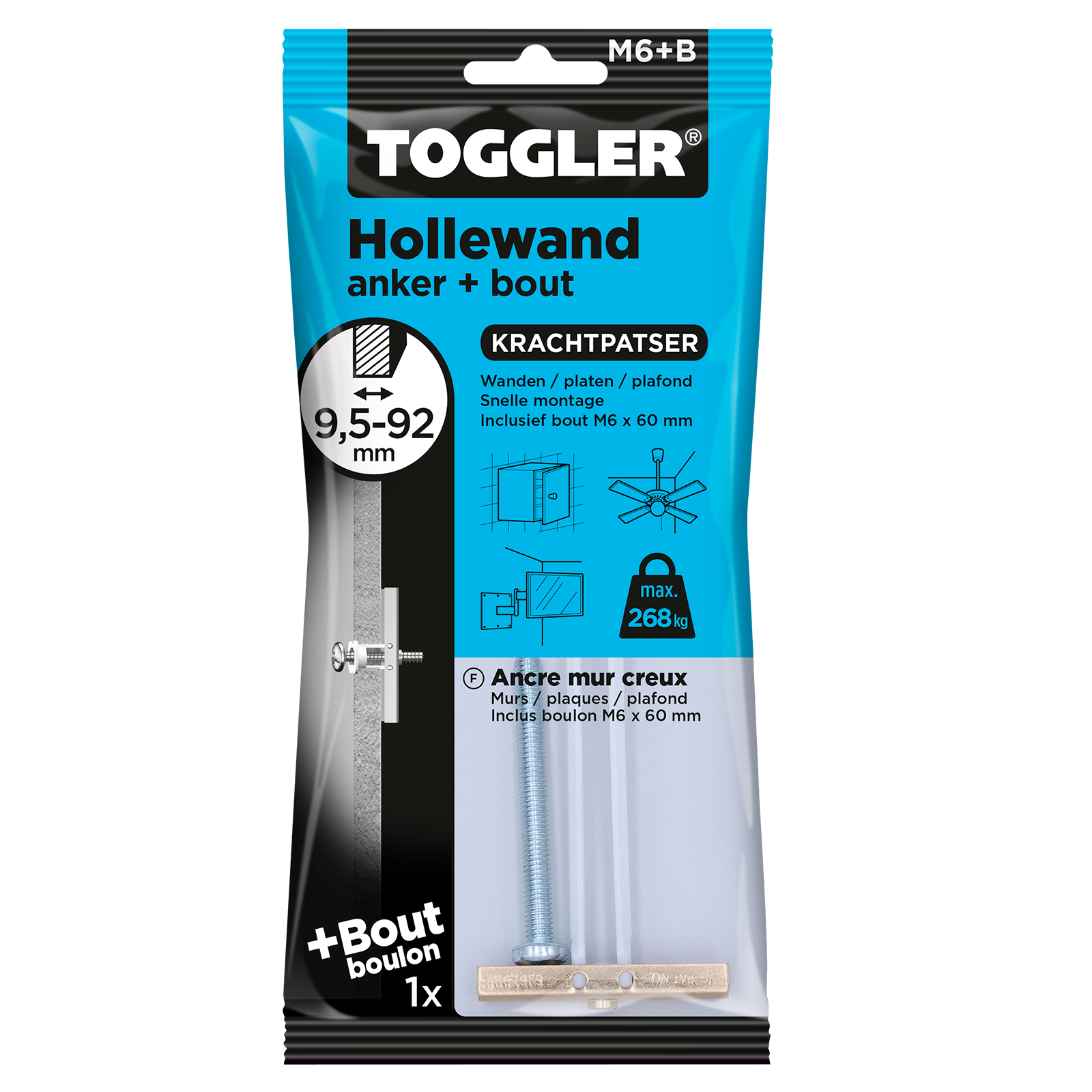 Het Toggler Hollewandanker M6 is geschikt voor het bevestigen van voorwerpen aan holle wand, plafond, 5 cm dik cellenbeton en plaatmateriaal, zoals gipsplaat van 9,5 of 12,5 mm dik. Monteer het anker snel en eenvoudig met behulp van de montagestrips. Je hebt hiervoor geen extra gereedschap nodig. Is de ruimte achter de plaat groter dan 52 mm? Dan past het Hollewandanker altijd. Het anker heeft door het grote draagvlak achter de plaat een ijzersterke houvast.